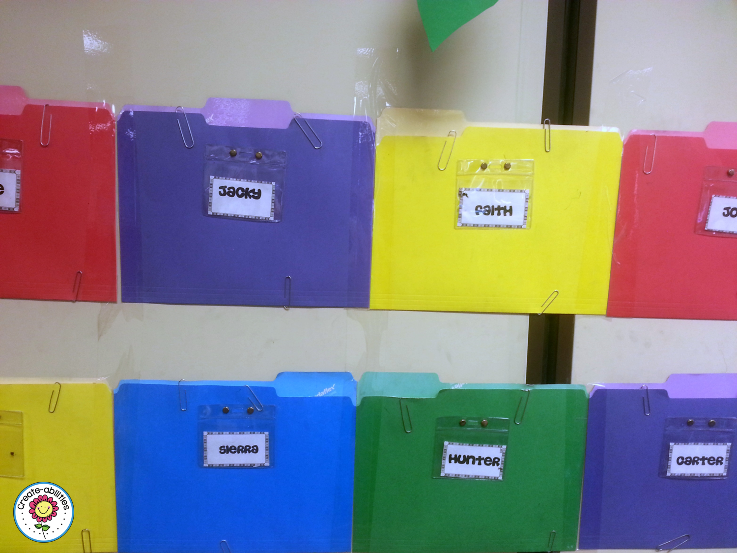 Now some teachers use the opening in the top for students to turn in work and get it passed back to them. That is an option. However, with how rough my little 3rd graders could be on paper, I didn’t want to be changing the folders every single year. The folders in this picture are five years old. You could also have your wall folders hang vertically instead of horizontally.
